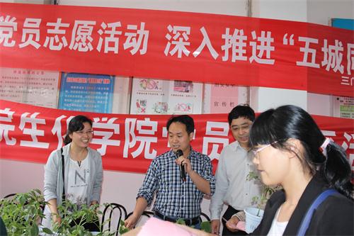 2015年5月22日下午,生化學院聯合長東街道三門社區在白鹭花園小區開展了“為你家陽台增添一抹綠色”黨員進社區志願服務活動。學院黨委劉強輝書記、周定晖副書記和園景系部分教師黨員參加了服務活動。
