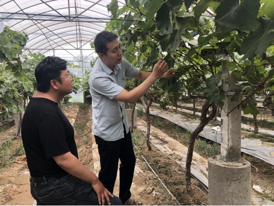 活動期間,黨員教師到淮海農場高效園種植園區查看苗木生長情況。王雲鵬教授現場就葡萄膨果期管理、梨樹和桃樹等果樹病蟲害防治給予技術指導。靳叢博士向技術員手把手地傳授葡萄打枝、綁蔓和疏果技術。