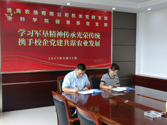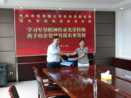 在淮海農場公司會議室,園景系黨支部與淮海農場機關黨群支部就支部黨建工作、産學研合作事宜進行了交流。淮海農場紀委書記李大維介紹了農場發展曆程、企業文化和支部建設情況。生科學院黨委副書記夏雪芹就學院的辦學特色、人才技術優勢和黨建工作方面作了交流,她指出,生科學院園景系的前身就是江蘇農墾職工大學,與江蘇農墾系統有着深厚的聯系,希望生科學院和淮海農場将友誼和事業共同傳承下去。生科學院王雲鵬副院長就學院人才培養、科研與社會服務方面作詳細介紹,并對雙方前期産學研合作進行了回顧,希望今後進一步拓寬校企産學研合作的廣度和深度。雙方表示在支部黨建、技術人員實用技能培訓、實驗實踐教育基地、成果轉化方面多加強合作。會上,雙方共同簽訂了實習與就業基地合作協議書,為下一步合作交流奠定了堅實的基礎。