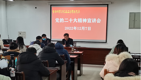11月7日下午,學習貫徹黨的二十大精神校宣講團成員、校黨政辦主任韓錦标教授到學院宣講黨的二十大精神。生科學院黨委書記朱永江主持報告會。學院領導班子成員、全體教師、學生代表現場聆聽報告。