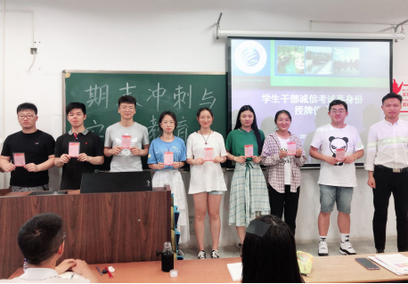 班會主要圍繞學業預警、期末考試安排、考風考紀教育等精心,班會上,對班級學生黨員、學生幹部進行了“誠信考試亮身份”授牌儀式,要求學生黨員、學生幹部每次考試主動出示誠信考試的身份标識卡,以身作則,遵守考場紀律,充分發揮學生黨員、學生幹部等學生骨幹力量在學風建設中的示範引領作用。