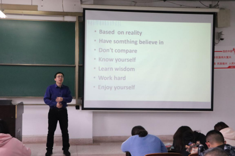 羅老師圍繞“Your Career in Changing Times”這一主題,根據自身經曆,對如今社會、科技等方面的發展變化進行分析,全程英文、幽默風趣,引導大家進入話題。首先,羅老師指出面對日新月異的社會變化,大家要學會适應改變,提高自己。他倡導大家應該學會創新、培養領導才能、加強溝通技巧,不能做一個漫無目的的追随者。接着,羅老師對于職業與收入進行了客觀的闡述,他認為一個人受到收入預期的激勵,并不一定是錯誤的,畢竟,謀生是生活的一部分。錯誤之處在于,職業決策主要是基于對未來收入的考慮。羅教授根據自己及身邊的經驗,分析了獲得成功的關鍵方法是你應該明确什麼是你能做到最好的,然後去做。最後,羅教授提出我們應該積極進行創新創業。當然自主創業并不是對每個人都合适,它需要大量的精力與動力以及知識與思想儲備才能堅持到底。羅教授還給大家提供了一些注意事項,在擇業或創業時大家要基于現實、了解自己、認真努力,有目标、有信仰。