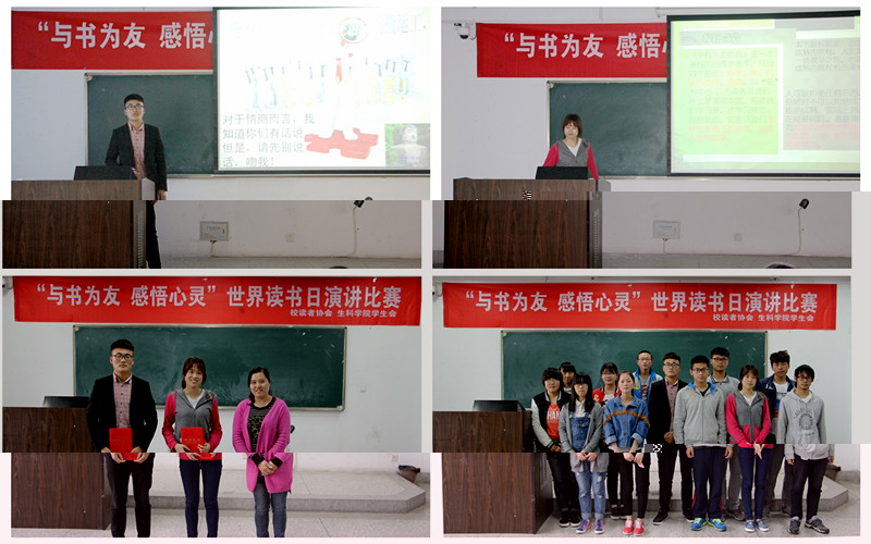 4月27日下午,生科學院連同校讀者協會于22208教室舉辦了“與書為友,感悟心靈”世界讀書日演講比賽。比賽邀請了張愛芳老師、體育部部長劉赟、學習部部長張威擔任評委,參賽的選手為“春日送溫暖”勵志圖書受捐對象。