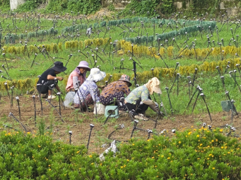 圖為中皇村菊園和農民為菊園除草 蔣其楓攝