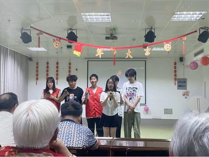 活動中,音樂成為了連接心與心的橋梁。一曲曲紅色經典旋律悠揚響起,不僅喚醒了老人們的美好回憶,更以音樂的力量撫慰心靈,促進了身心健康。老人們在同學們的邀請下,紛紛加入合唱,現場洋溢着溫馨與歡樂,展現了跨越年齡的和諧與共鳴。