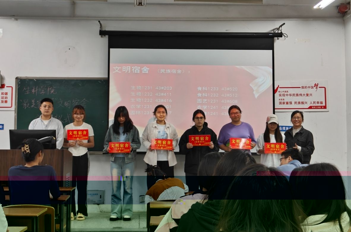 5月15日中午,生科學院在22108教室舉行2025年春季“最美宿舍”、“文明宿舍”重點創建月活動頒獎儀式。學院黨委副書記張月、學工辦主任餘文沖、分團委書記王曉樂、輔導員張愛芳、蘇子亮、生活部成員及獲獎宿舍代表參加活動。