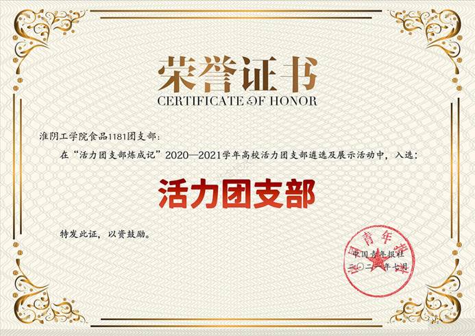 為深入貫徹落實“全團大抓基層”、“全團抓學校”部署,深化高校共青團改革,強化“一切工作到支部”理念,在團中央基層建設部指導下,中國青年報社開展“活力團支部煉成記”2020—2021學年高校活力團支部遴選活動。我院食品1181班團支部以出色的班風、學風、團組織作風,被評為2020—2021學年全國高校“活力團支部”稱号。