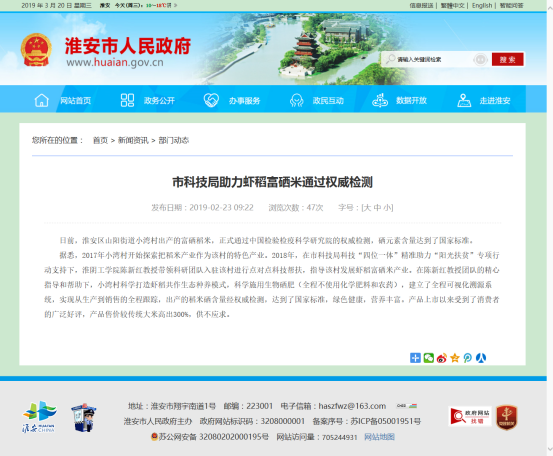 伟德国际1946官网2018年度“陽光扶貧”項目實施近一年來,幫助淮安區小灣村建設優質富硒大米生産基地 1個,示範推廣300畝,開發富硒優質食味大米産品1個,培訓農民150人次,幫扶貧困戶45家,為貧困戶提供有機富硒肥料,指導培訓農戶硒肥的實施,進行富硒水稻全程田間生産管理技術服務。經中國檢驗檢疫科學研究院的權威檢測,硒元素含量達到國家标準,富硒大米受到市場熱捧、産品質好價高,供不應求。2018年,該項目每畝水稻增收320多元,為村集體(小灣生态農業專業合作社)增加收入10萬元左右。項目受到了小灣村和貧困戶的歡迎。淮安市人民政府網進行“市科技局助力蝦稻富硒米通過權威檢測”跟蹤報道。