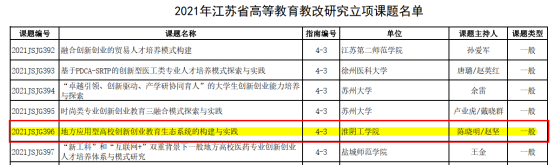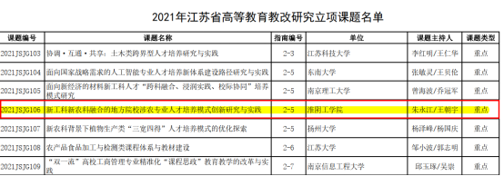 根據江蘇省教育廳發布《關于公布2021年江蘇省高等教育教改研究立項課題評選結果的通知》,我院朱永江教授和王朝宇教授共同申報的“新工科新農科融合的地方院校涉農專業人才培養模式創新研究與實踐”獲得重點項目立項;我院陳曉明教授和創新創業學院趙堅副院長共同申報的“地方應用型高校創新創業教育生态系統的構建與實踐”獲得一般項目立項。教育教改研究課題是深化教師培養模式的改革、推動應用型人才培養教育轉型升級、提高教師教育教學水平,提升學生培養質量、形成優秀教學成果的一項重要抓手。我院近年來對教育教學改革非常重視,學院教師參與度高、積極性強。上述2個江蘇省高等教育教改項目的立項,極大的促進我院教育教學質量的提升。