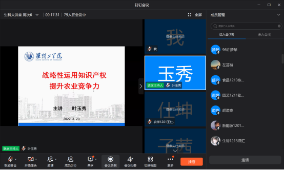 3月23日下午,生科學院于線上釘釘群開展了以“戰略性運用知識産權提升農業競争力”為主題的第一期生科大講堂講座。本期主講教師為生科學院葉玉秀博士,生科學院部分學生參加了此次講座。