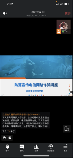 為進一步加強學院防詐騙教育宣傳工作,提高全體學生防詐騙意識,預防學院電信詐騙事件發生,3月31日晚19:00,生科學院利用網絡平台舉辦防範電信網絡詐騙專題講座,特邀校保衛處副處長趙宏主講。學院相關領導、全體輔導員及全院一千餘名學生參加,講座由學院黨委副書記、副院長夏雪芹主持。