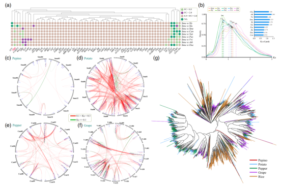 人參果(Solanum muricatum, 2n = 2x = 24)是茄科植物(Solanaceae)中一種重要的全球性種植水果,此研究得到了高質量的、染色體水平的人參果基因組。91.67%的基因組序列固定在12條染色體上,總長度為1.20 Gb,scaffold N50為87.03 Mb。超過一半的基因組由重複序列組成。除了雙子葉植物共有的古老的全基因組三倍體化(WGT)事件外,在人參果中還存在一次新的WGT事件。該研究結果表明,在WGT事件後,人參果經曆了染色體重排、融合和基因缺失。大量的基因缺失表明茄科植物基因組的不穩定性,為物種分化和自然選擇提供了機會。