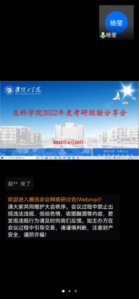 4月24日下午14:30,生科學院利用網絡平台舉辦“研途築夢想經驗助成功”考研經驗分享會,邀請2018級各專業、各班級共9名考研錄取的同學進行考研經驗分享。2019級全體考研同學參加此次分享會。會議由生科學院學工辦副主任餘文沖主持。