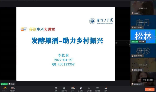 4月27日下午,生科學院于線上釘釘群開展了以“發酵果酒-助力鄉村振興”為主題的第六期生科大講堂講座。本期主講教師為生科學院李松林博士,生科學院部分學生參加了此次講座。