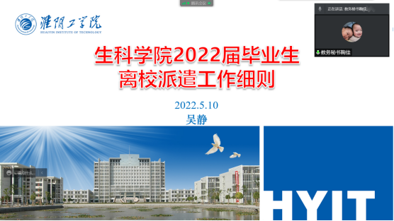 為了做好2018級畢業生離校前相關工作,保障畢業生安全有序畢業離校,5月11日晚,生科學院利用騰訊會議平台召開“揚帆起航 再創輝煌”2018級全體學生畢業工作大會。院黨委副書記、副院長夏雪芹,學工辦副主任餘文沖,教務秘書鞠佳,輔導員夏繼林、韓立宇、吳靜參加本次會議,會議由餘文沖主持。