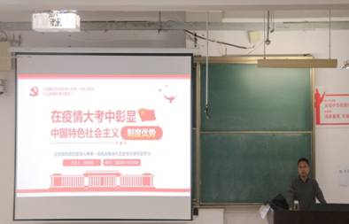 周定晖副書記以“制度優勢凝聚中國力量”為主題向同學們介紹了中國特色社會主義制度在堅持黨的集中統一、密切聯系群衆、堅持全面依法治國、集中力量辦大事四個方面體現的優勢。他強調我們要憑借中國特色社會主義制度的優勢,在法治軌道上統籌推進各項防控工作,全面提高依法防控、依法治理,保障疫情防控工作順利開展,維護社會大局穩定。